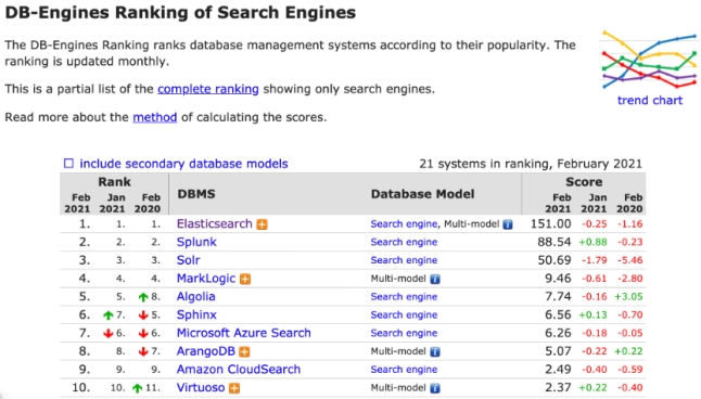 据DB-Engines官网搜索数据显示,ES产品流行度、需求度综合排名稳居第一,ES和行业的市场规模也已经达到亿元量级。
