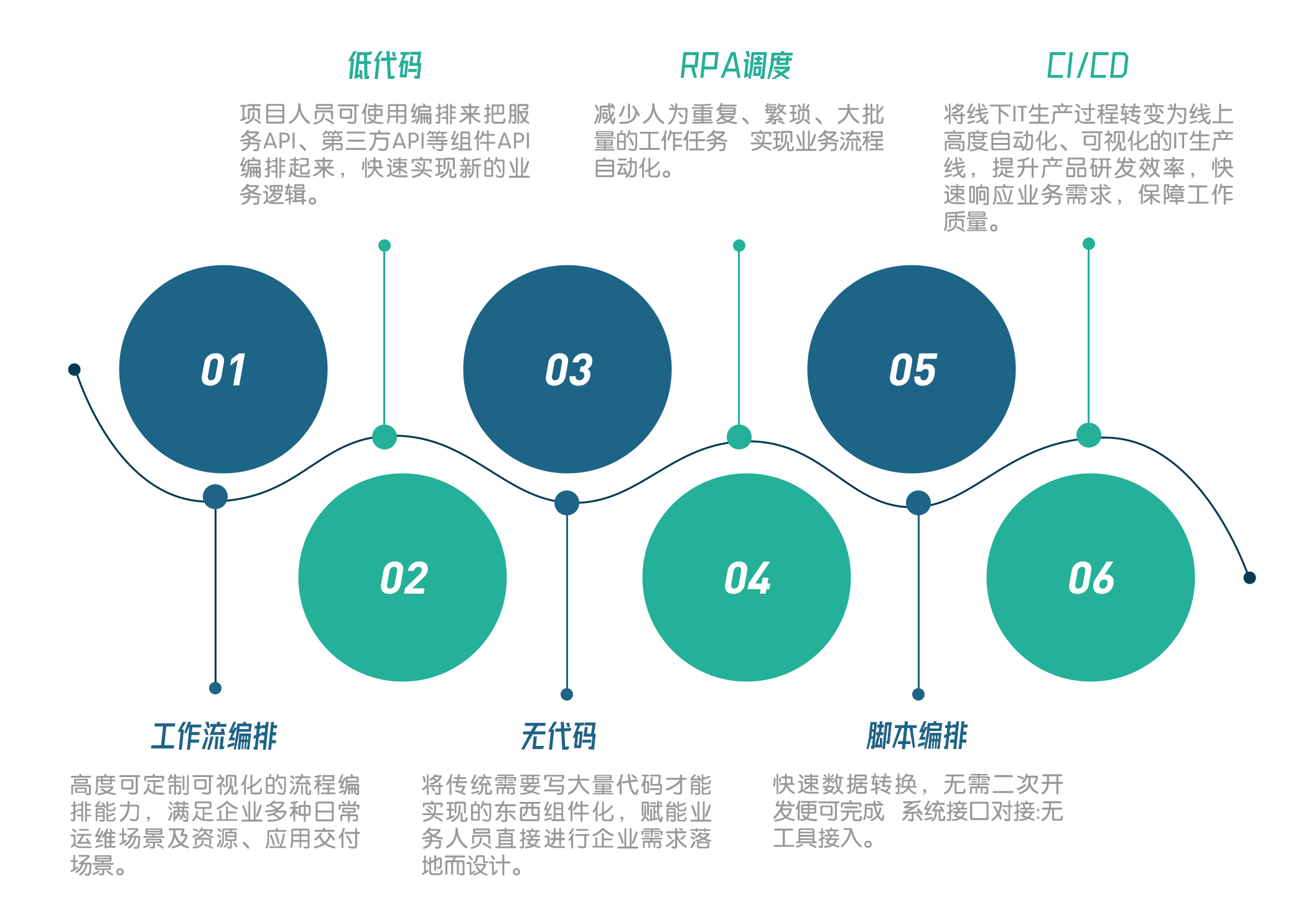 精鲲JKSTACK构建的业务自动化编排平台DPA云原生版本,可通过组件化封装、拖拉拽方式,跨技术栈的进行全局编排形成自动化业务执行流,接入编排对象包括应用API、RPA、脚本任务、运维工具、数据处理工具等,实现从简单到复杂交互的数字化场景,助力企业提升业务运营效率、增强决策敏捷性。