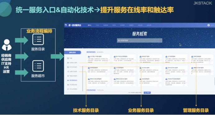 JKSTACK DSM定位是作为企业内部业务流的自动化服务门户,让原先线下各种跨部门、跨系统、跨数据的复杂工作流程,都被编排为标准化服务对外统一展现,并结合对象用户角色权限展现可访问的服务。通过选择服务自动触发各项业务流,告别原先人找人、人找系统、人找数据的麻烦。
