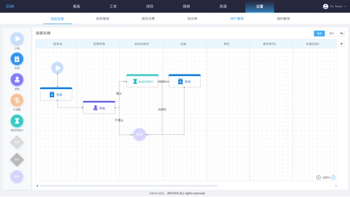 在JKSTACK DSM中用户可以创建各类业务的流程逻辑,在流程中支持加入审批和多人处理方式、第三方API以及JKSTACK自身后端iPaaS自动化能力。为了降低使用门槛,赋能非编程背景的人员也能快速上手,用户可通过可视化设计器拖拽方式实现所有流程与表单设计。