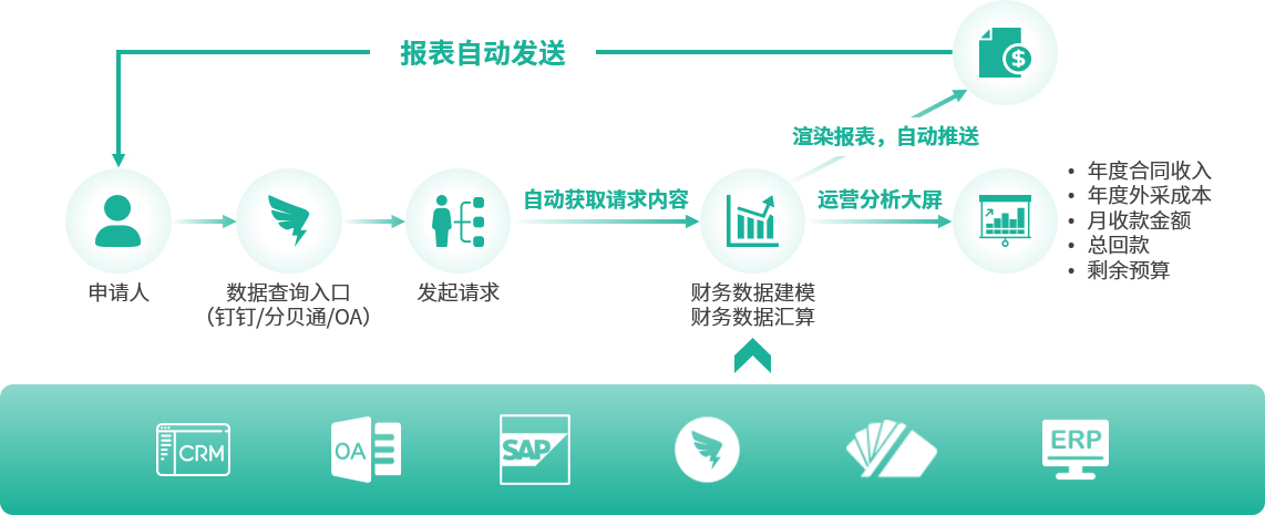 通过数据编排能力完成各个财务数据源抽取,建模,汇算,渲染报表并发送