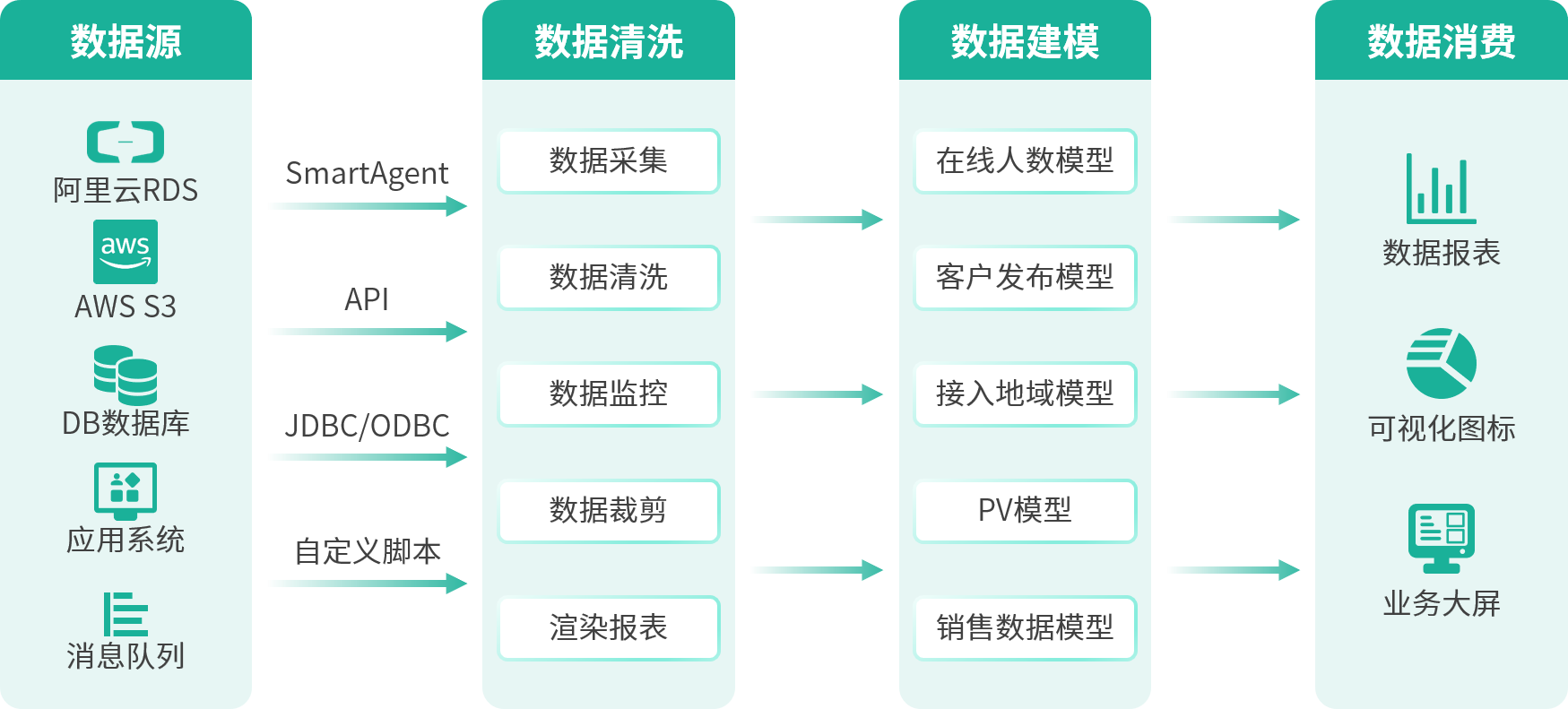 落地实践依托数据管道可视化画布,以API,DB,SmartAgent等数据连接器构建不同数据类型的采集、清洗、汇总等过程