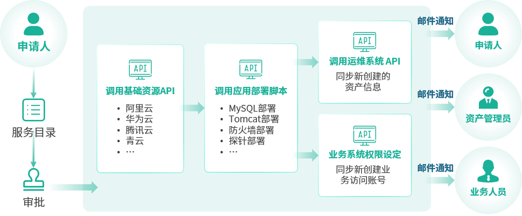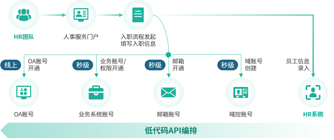通过自动化能力整合AD域、邮箱、CRM、OA等业务,实现多系统账号的一键开通或注销