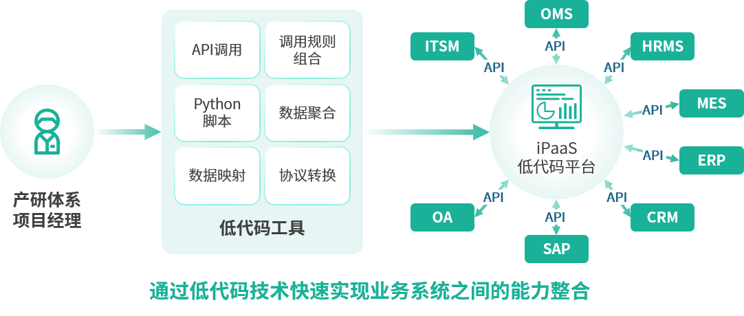 通过iPaaS的集成平台与第三方CRM、PMS等第三方系统的无缝对接、代码零开发